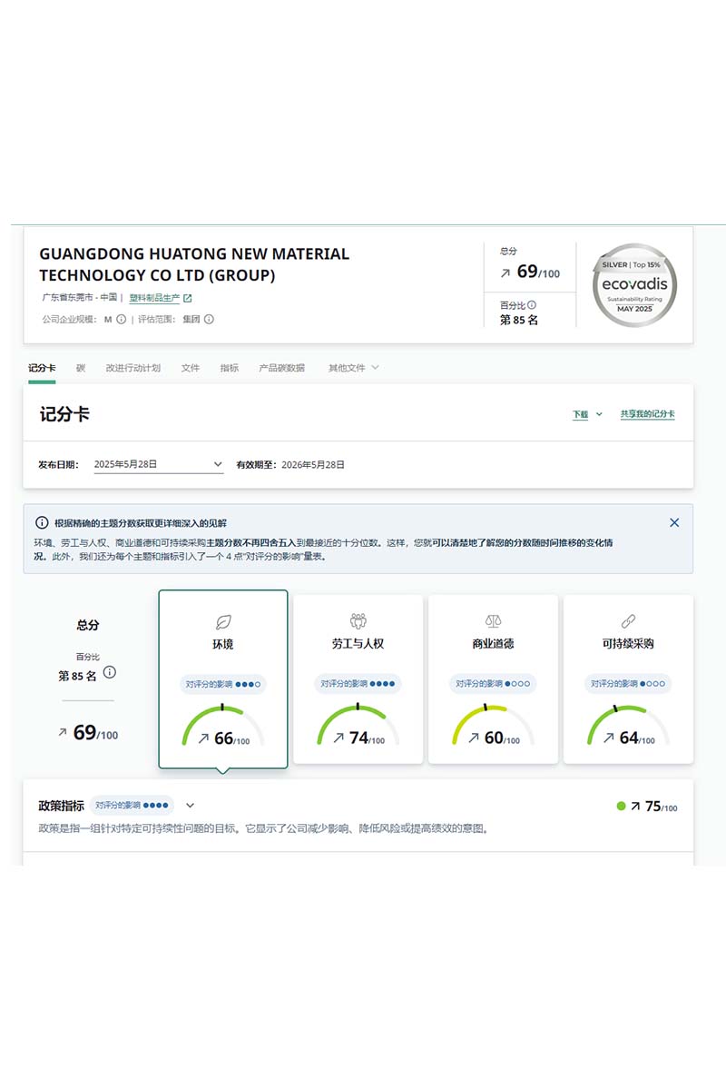 Guangdong Huatong New Material Technology Co., Ltd. was established in February 2012, located at No. 68, Zhenxing Avenue, Xiegang Town, Dongguan City, Guangdong Province, covering an area of 70,000 square meters, with a registered capital of 250 million RMB, is a high-tech enterprise specializing in the R&D and production of flexible packaging films. Huatong has obtained 14 patents, including 6 domestic utility model patents and 8 software copyrights EcoVadis Silver Medal.